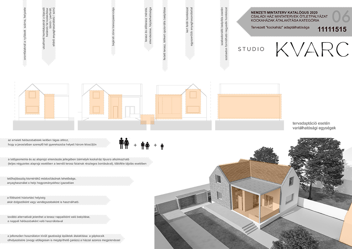 Jelen terv egy valóságban is létező, Komárom-Esztergom megyei kockaház geometriáját vette alapul. A Kádár-kockák között aprónak számító épülettípus nagyon elterjedt a településen, bántó kontrasztot képezve a hagyományos parasztházakkal. A terv olyan megoldási javaslatot mutat be, amelyben a sátortetős, széles traktusú tömegek úgy születhetnek újjá mai családok számára, hogy az egyben a megtépázott falusi utcakép állapotára is gyógyírt jelentsen.